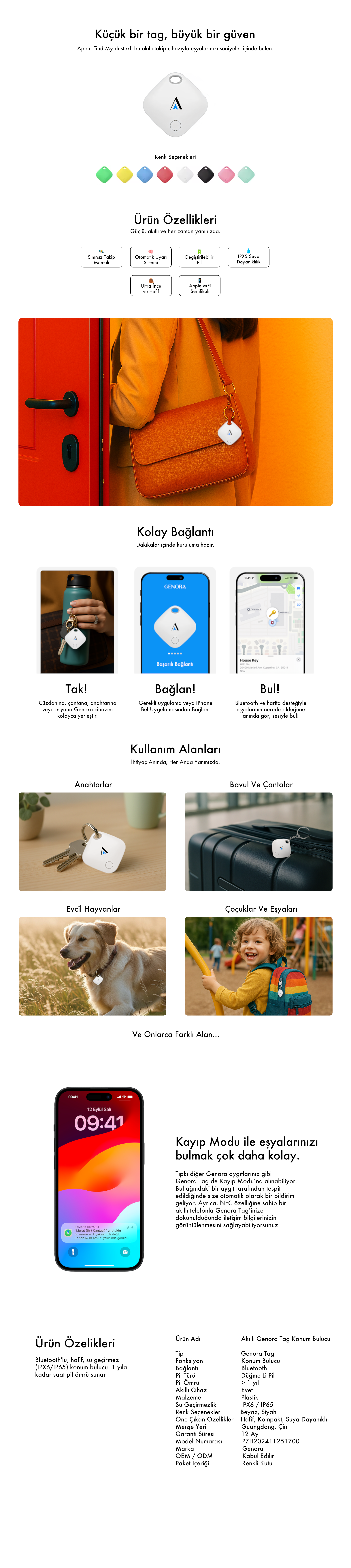 Genora Tag ile kaybetme endişesine son verin. Evcil hayvanlarınızdan eşyalarınıza kadar değerli her şeyi kolayca takip edin. Gelişmiş Bluetooth teknolojisi ve uzun pil ömrüyle Genora Tag, içinizin rahat etmesi için tasarlandı. Kayıp Modu ve iletişim paylaşma özellikleriyle kontrol sizde.